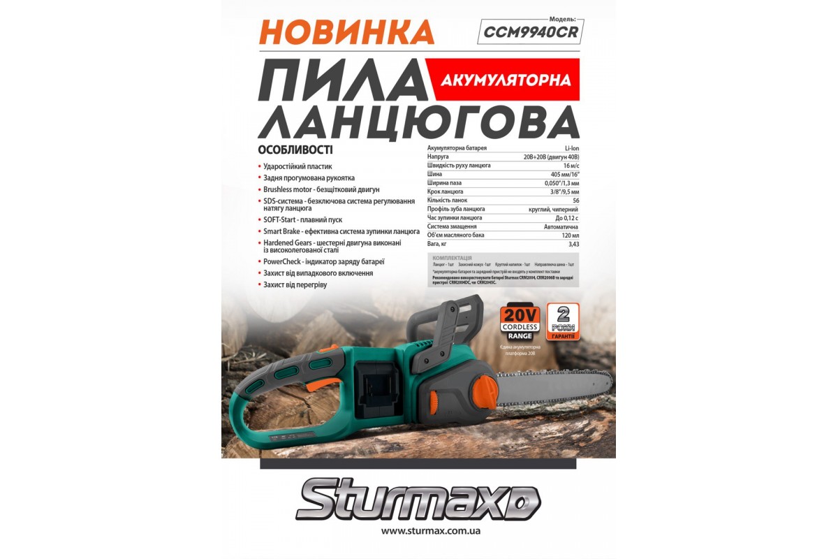 Sturmax CCM9940CR Акумуляторна пила + 2АКБ по 4Аг + зарядний пристрій