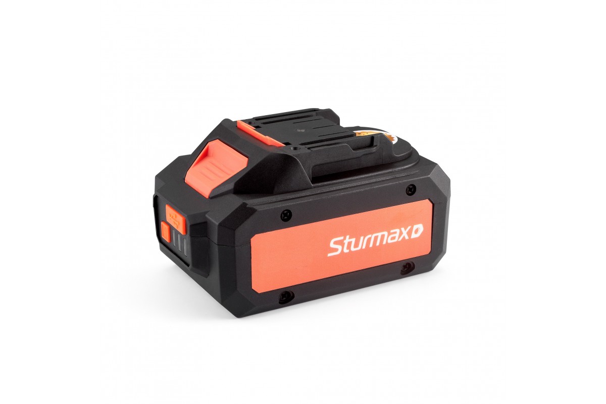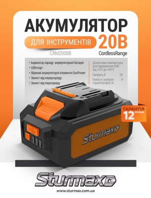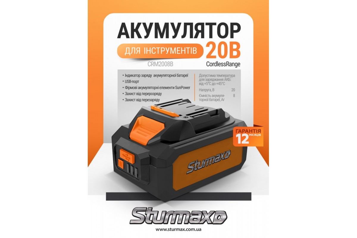 Sturmax CRM2008B – акумуляторна батарея збільшеної ємності лінійки інструменту Sturmax Cordless Range. Напруга – 20 В. Ємність – 8 А·год. Оснащена фірмовими елементами SunPower, які забезпечують високу надійність і тривалий термін служби, а також системою захисту від перезарядження і перерозрядження. Передбачено індикатор рівня заряду, що дозволяє візуально контролювати залишковий заряд батареї, а також USB-порт для підзарядки мобільних пристроїв і гаджетів.