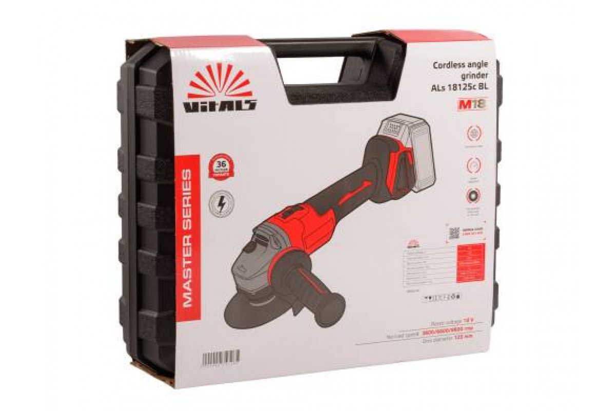 Шліфмашина кутова акумуляторна ТМ «Vitals», серія «Master», модель «ALs 18125c BL» виготовлена із дотриманням усіх вимог безпеки та є надійним інструментом для побутового використання. Вона призначена для шліфування, різання та зачищання металевих виробів за допомогою абразивних дисків. Принцип роботи базується на перетворенні електричної енергії на обертальний рух шпинделя, на який кріпляться змінні насадки. Конструкція включає безколекторний двигун, конічний одноступеневий редуктор у металевому корпусі, а також ергономічне подовжене руків’я з можливістю приєднання акумуляторної батареї.