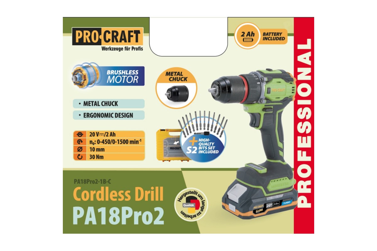 Шуруповерт Procraft PA18Pro2 (з 1 АКБ 2Аг) набір біт