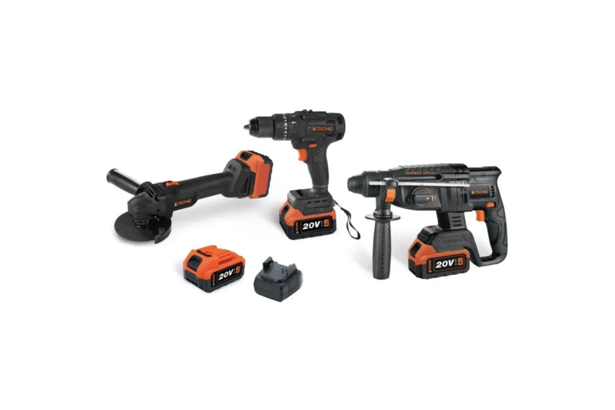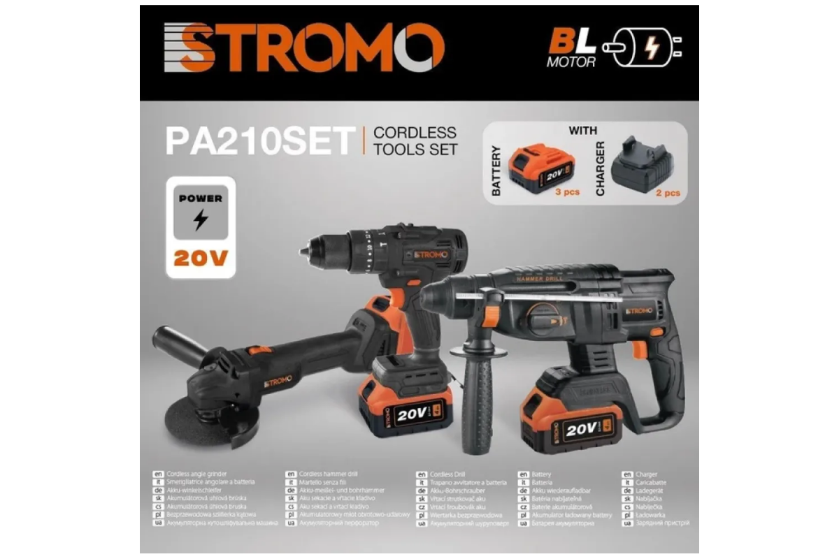 STROMO PA210SET — це універсальний набір для професійного та побутового використання, який включає болгарку, перфоратор і шуруповерт. Усі інструменти живляться від акумуляторів 20 В (Li-Ion) та оснащені безщітковими двигунами, що забезпечує високу надійність, ефективність і тривалий термін служби.