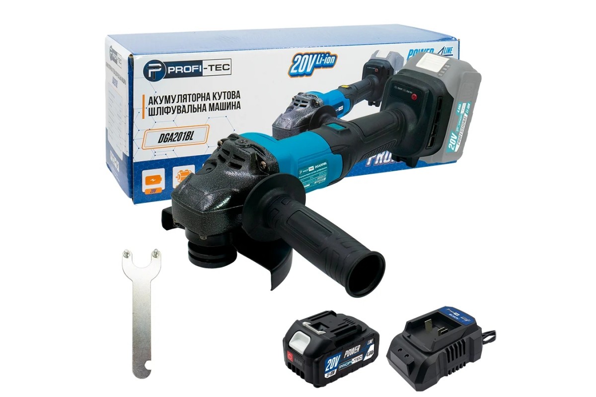 Акумуляторна кутова шліфувальна машина PROFI-TEC DGA201BL POWERLine (1×PT2040MP (4.0 Аг), зарядний пристрій)