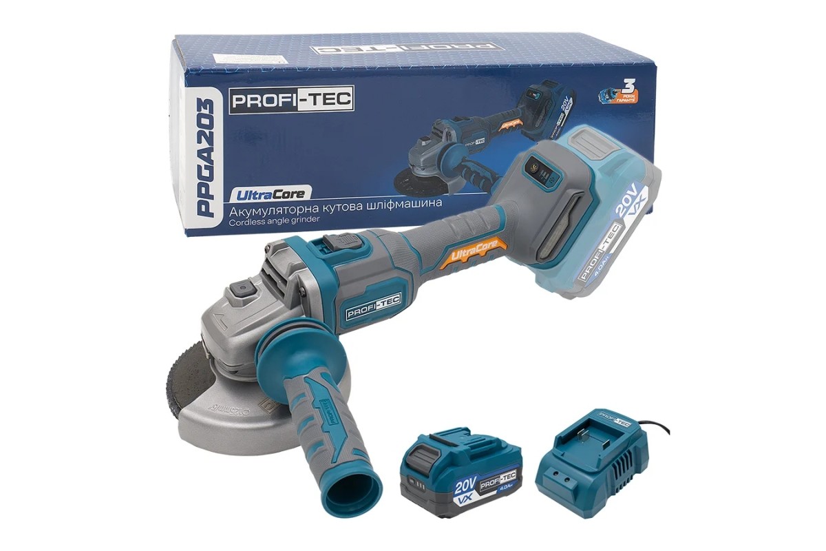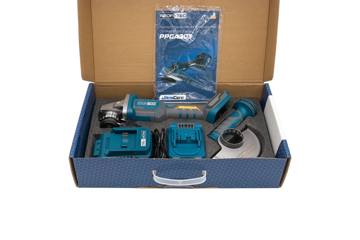 Акумуляторна кутова шліфувальна машина PROFI-TEC PPGA203 UltraCore (1×PT2040VX (4.0 Аг), зарядний пристрій)