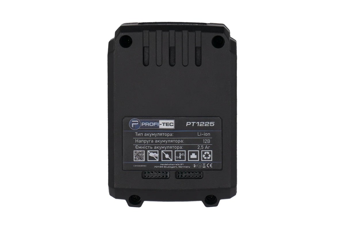 Акумуляторна батарея PROFI-TEC PT1225 потужністю 12 В / 2.5 Аг, призначена для роботи з акумуляторною ексцентриковою полірувальною машиною PROFI-TEC PPM-8012SCP, відрізняється надійністю та високою тривалістю роботи.
