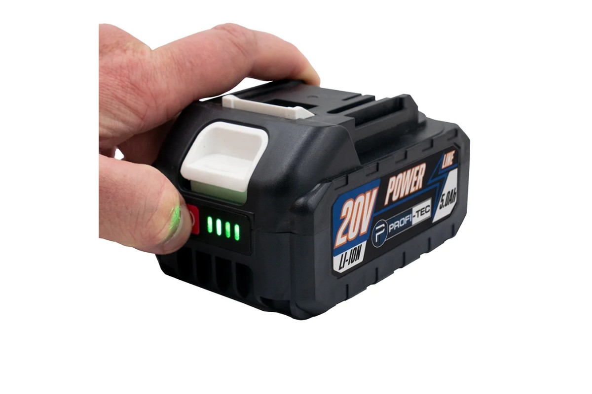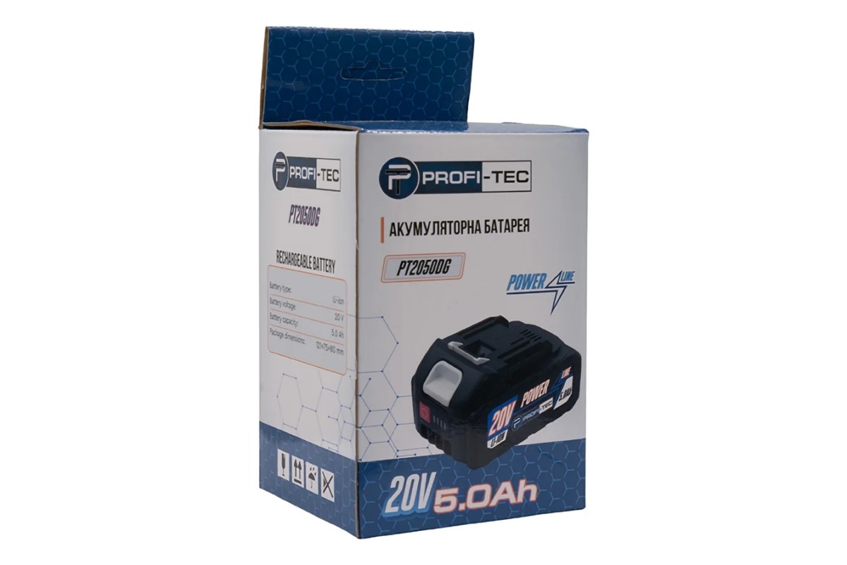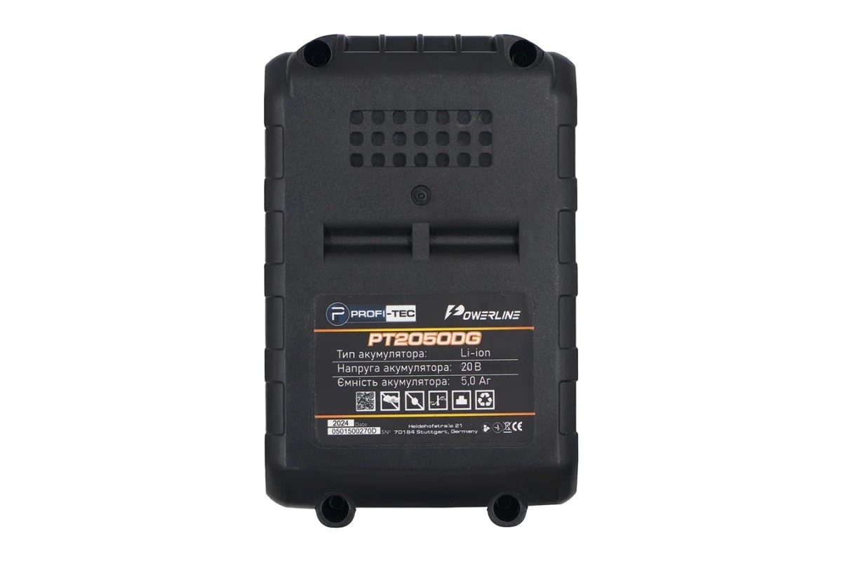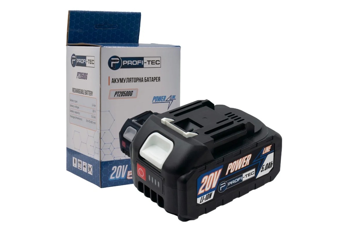 Акумуляторна батарея PROFI-TEC PT2050DG потужністю 20 В / 5.0 Аг, призначена для роботи на інструментах PROFI-TEC POWERLine, відрізняється надійністю та високою тривалістю роботи.