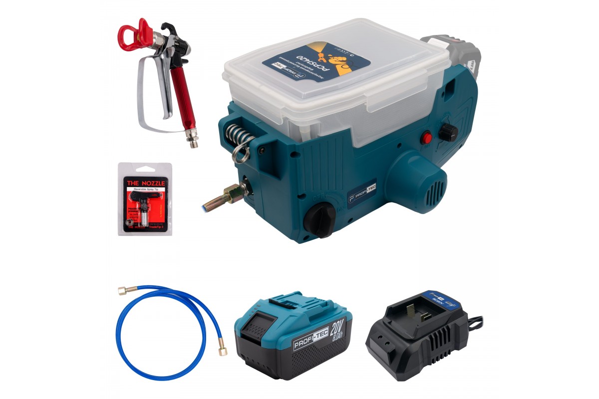Акумуляторний безповітряний фарбопульт PROFI-TEC PCPS1420 – потужний інструмент для швидкого та якісного розпилення лакофарбових матеріалів, грунтовок, морилок, засобів захисту деревини та рослин, масел, антикорозійних покриттів, дезінфікуючих засобів на основі розчинників і води та інших розчинних лакофарбових матеріалів на поверхнях різної складності.
