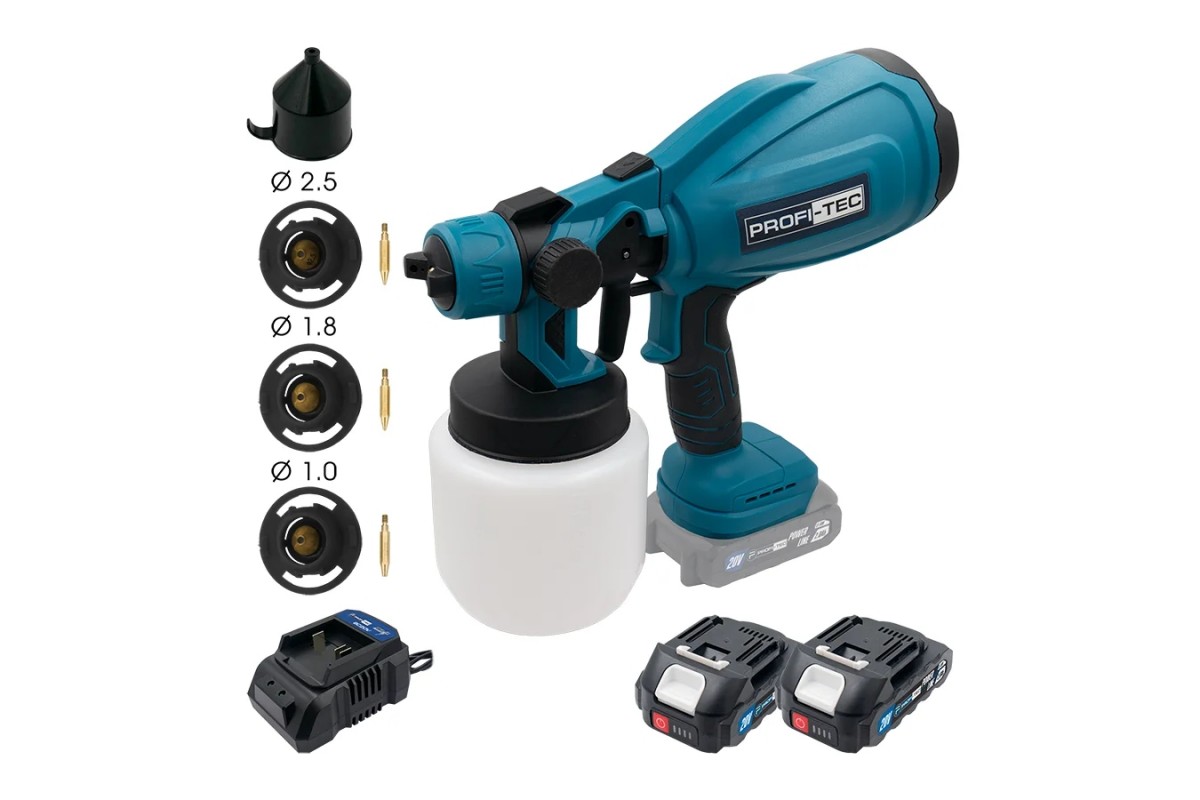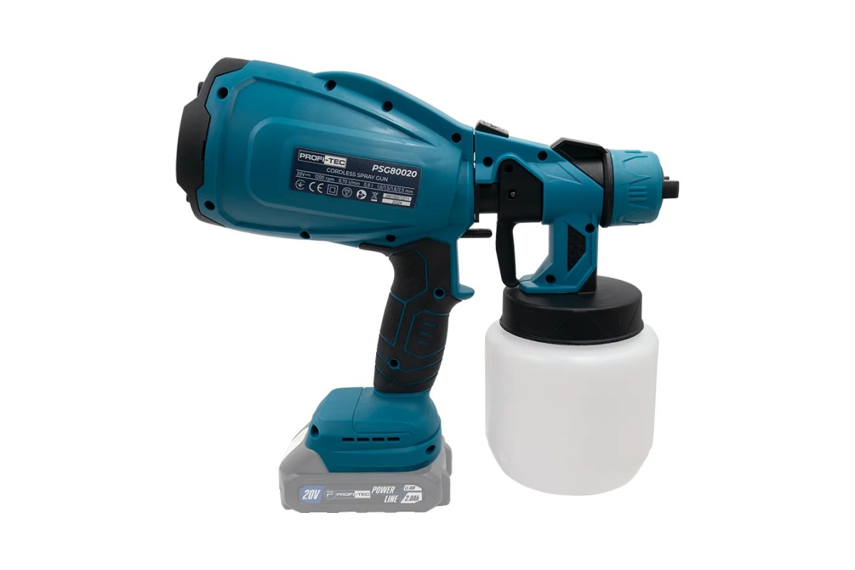 Акумуляторний фарбопульт PROFI-TEC PSG80020 – портативний та зручний інструмент, призначений для розпилення фарб, ґрунтовок, лаків та інших розчинних лакофарбових матеріалів на поверхнях різної складності та у важкодоступних місцях.