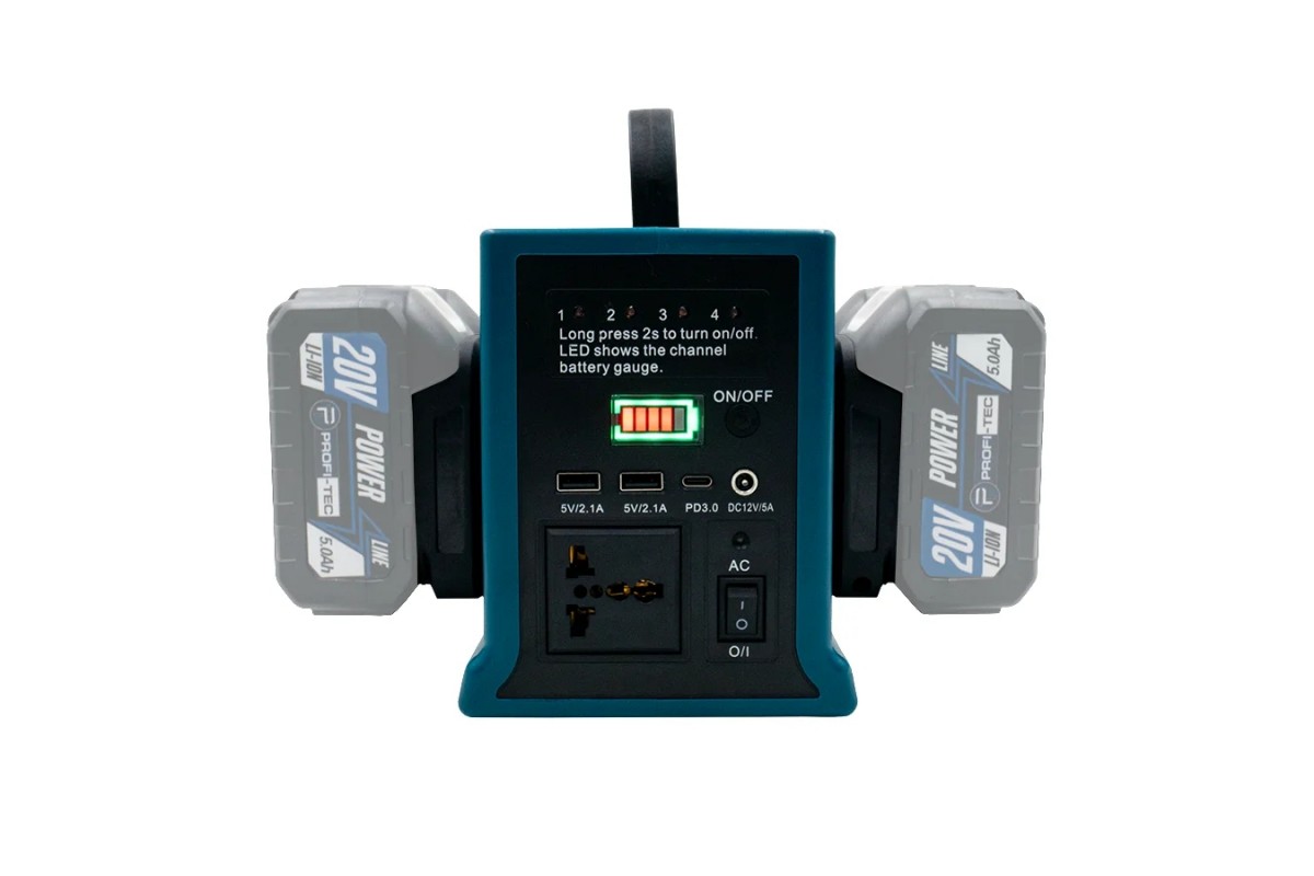 - Перетворює постійний струм, напругою 20 В, акумуляторної батареї в змінний струм 220 В, для живлення портативної техніки;