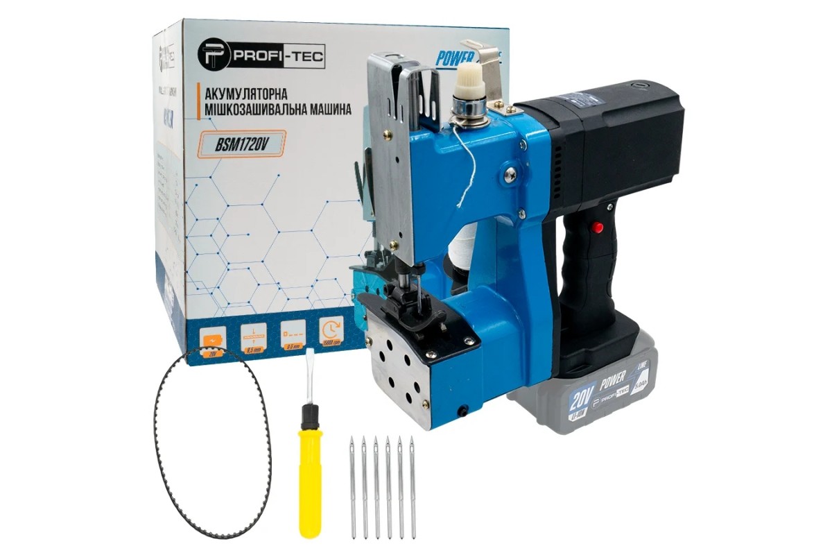 Акумуляторна машина для зшивання мішків PROFI-TEC BSM1720V – зручний та універсальний інструмент задопомогою якого можна робити надійні і міцні стібки на різних полотнах, таких як, поліпропілен, поліетилен, груба і щільна льняна, бавовняна тканина (брезент), папір, кенаф, джут та інші матеріали, товщина яких, може досягати 8,5 мм. Пристрій відноситься до різновиду швейної техніки, яка найчастіше застосовується у виробничій, комерційній сфері, а іноді навіть в побуті.