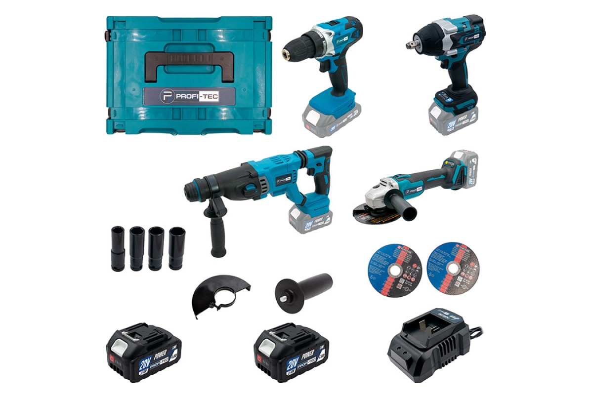 Акумуляторний набір інструментів PROFI-TEC Combo Set 4/4 POWERLine (PBH201BL, DTW800BL, DGA20BL, PCD2820V) (2×PT2040MP (4.0 Аг), зарядний пристрій)