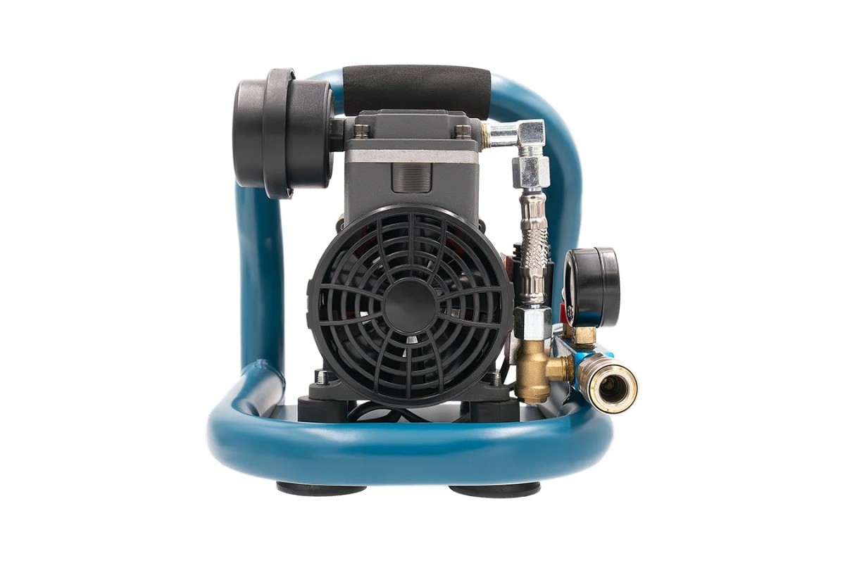 - Портативна конструкція з ручкою полегшує переміщення компресора і підвищує зручність транспортування під час роботи.