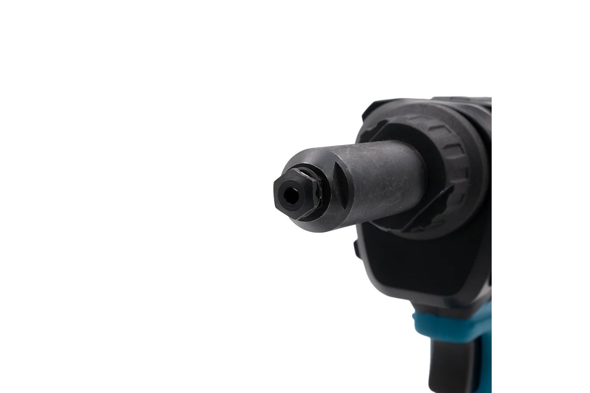 - Система швидкої заміни насадок значно спрощує адаптацію інструмента до роботи з різними типами заклепок, що економить час та підвищує загальну продуктивність;