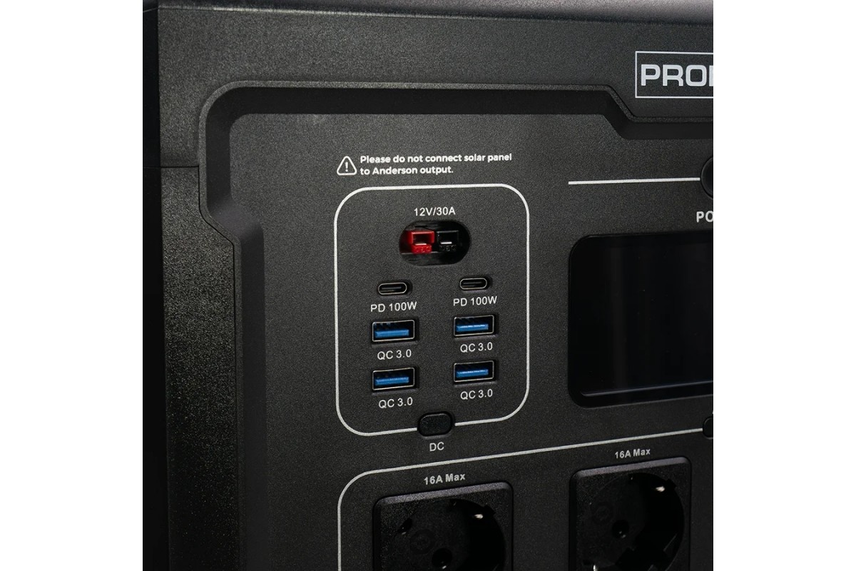 - Універсальні варіанти підключення включають виходи USB-A, USB-C (до 100 Вт), розетки змінного і постійного струму. Заряджання можливе від автомобіля, сонячних панелей (MPPT до 2100 Вт) та бензинового генератора;