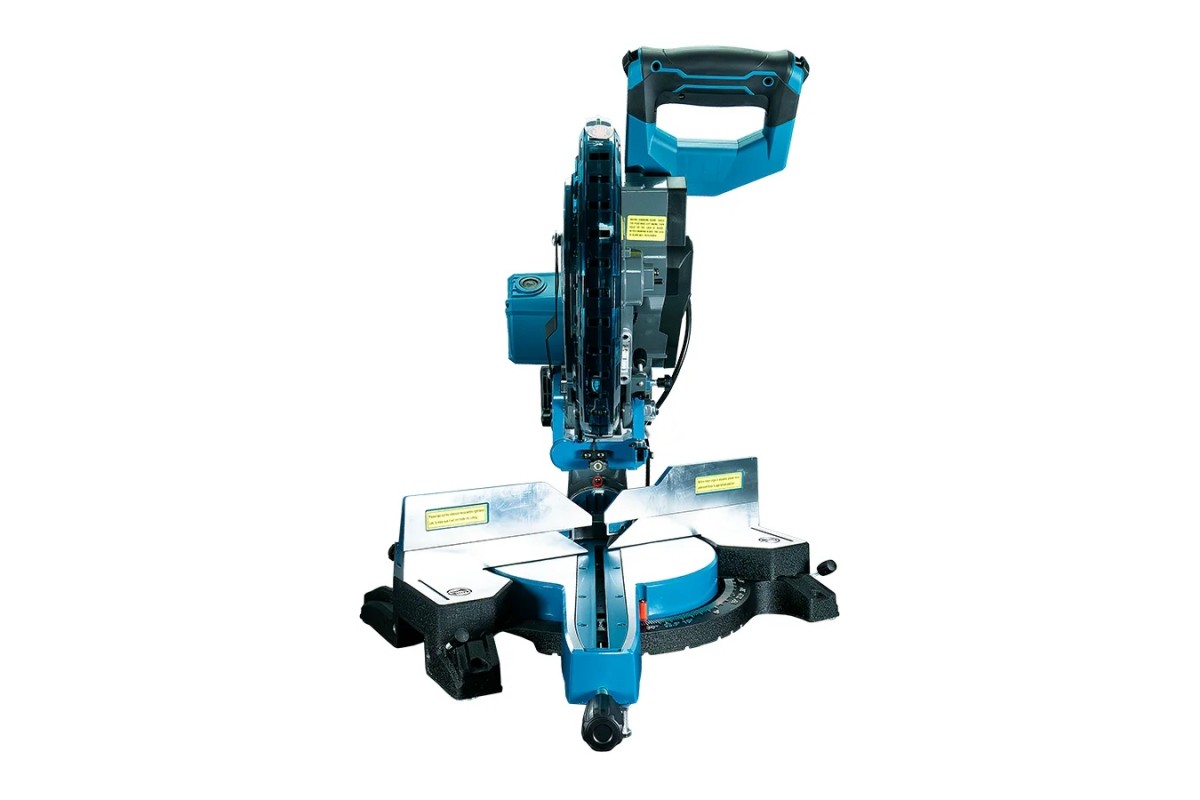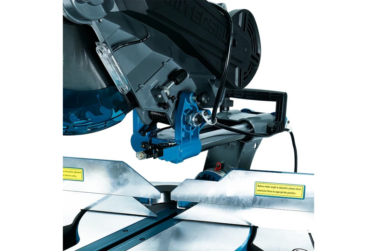 - Двосторонній нахил пиляльної голови дозволяє виконувати складні пропили під різними кутами без зміни положення заготовки.