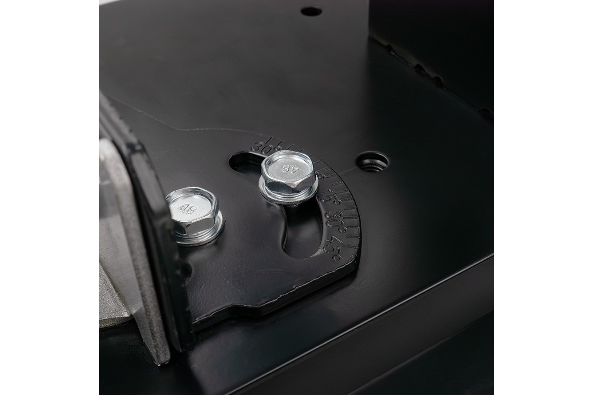 - Лещата з можливістю повороту до 45° забезпечують точне виконання як прямих, так і кутових різів без потреби додаткових налаштувань.