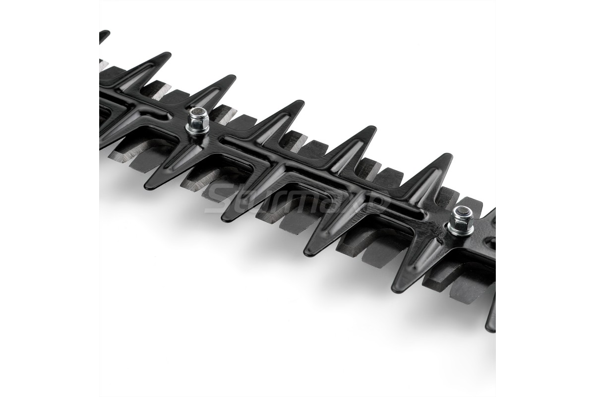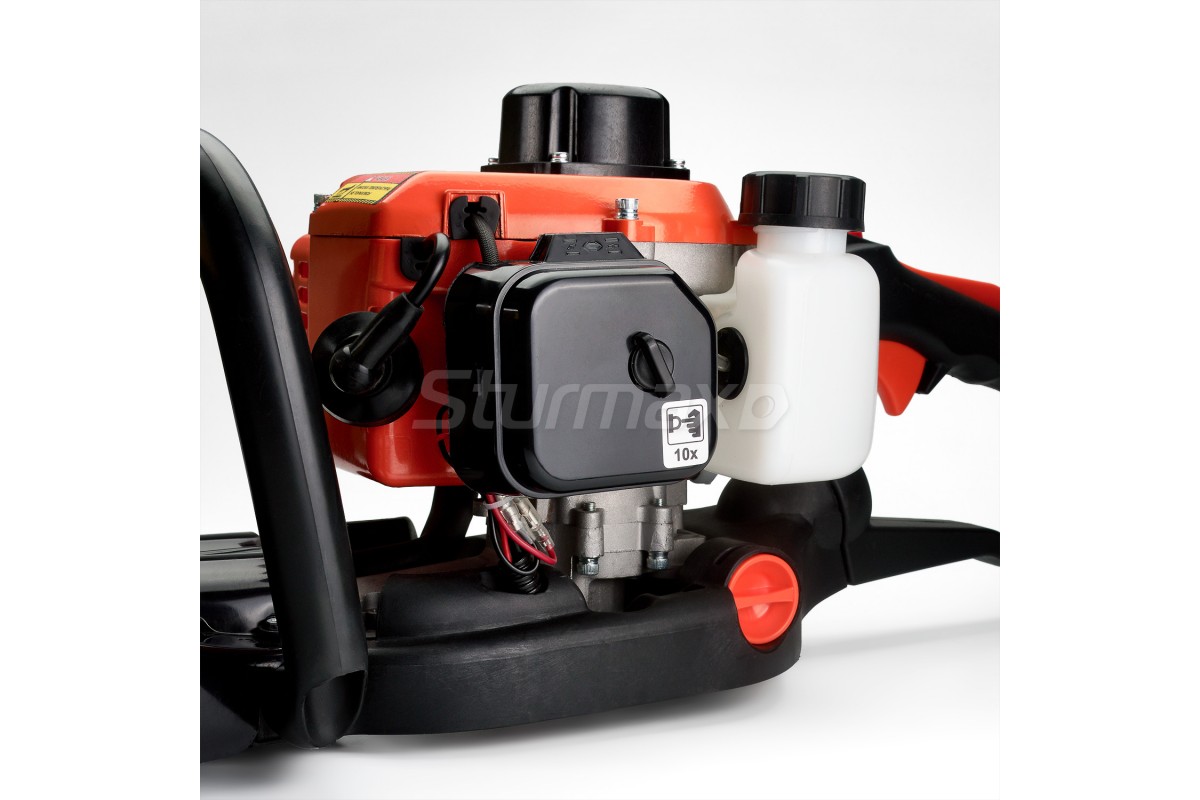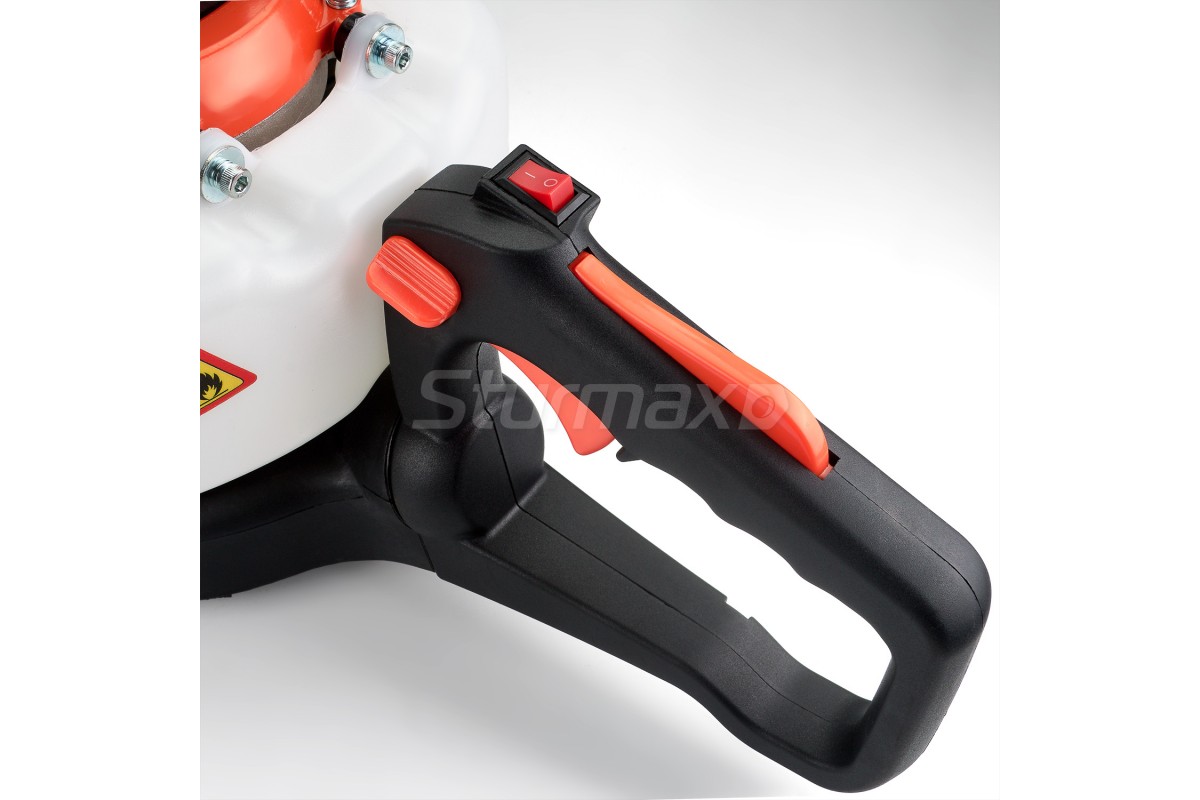 Sturmax TGM1023 – потужний та надійний бензиновий кусторіз. Призначений для швидкого та точного формування чагарників та декоративних насаджень, видалення зайвої порослі та підтримання охайного вигляду живоплотів. Забезпечує ефективне скошування як м’якої, так і жорсткої рослинності. Модель оснащена бензиновим двотактним двигуном робочим об’ємом 25.4 см³, потужністю 950 Вт, який гарантує високу продуктивність та стабільну роботу навіть при інтенсивних навантаженнях. Швидкому та впевненому запуску інструмента сприяє наявність насоса підкачки пального (праймера), а також системи «EasyStart», що значно знижує зусилля на шнурі стартера при запуску. Для комфортної роботи кусторіз обладнано антивібраційною системою, що включає чотири амортизатори-демпфери. Це значно знижує рівень вібрації, зменшуючи навантаження на руки оператора при тривалому використанні інструмента. Ефективна ріжуча система з високоміцним сталевим лезом довжиною 650 мм забезпечує чистий та точний зріз, дозволяючи легко справлятися з густими заростями та твердими гілками до 25 мм товщиною. Поворотна конструкція задньої ручки дає можливість працювати в різних положеннях, що робить обробку складних ділянок та фігурне формування чагарників більш зручним. Для додаткового захисту передбачено спеціальний щиток, який запобігає розльоту зрізаних гілок та дрібної стружки в бік оператора. Це робить експлуатацію кусторіза більш безпечною, особливо при роботі з густими заростями.